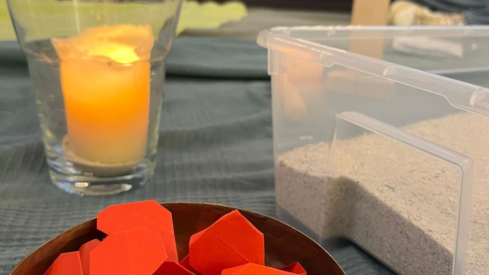 Nach dem Teilen der gemeinsam formulierten Fürbitten, bei denen wir Kerzen angezündet haben, konnte sich jede:r Teilnehmende eine der Liebesbotschaften mitnehmen. Die übrigen Nachrichten können nun an unserem Tor mitgenommen werden, für sich selbst oder zum weiterverschenken. So trägt die Liebe aus unserem Jugendgottesdienst hoffentlich auch weitere wurzeln.